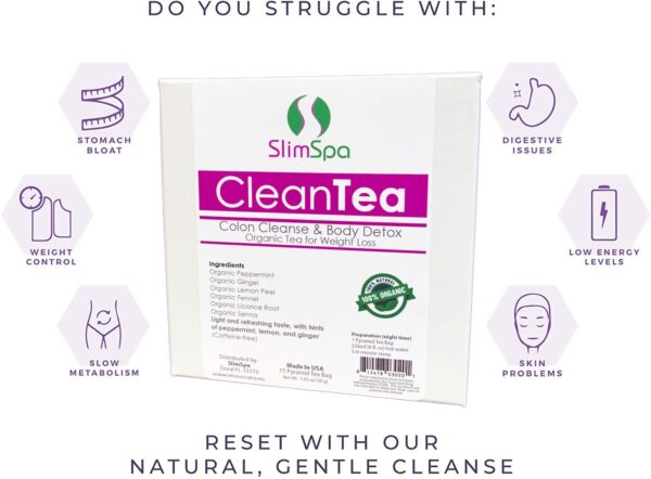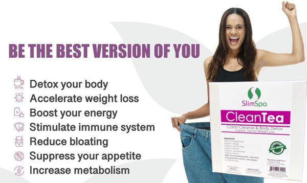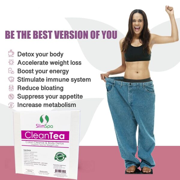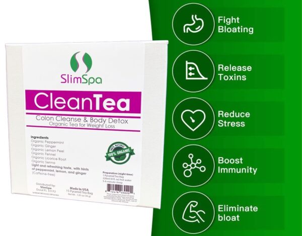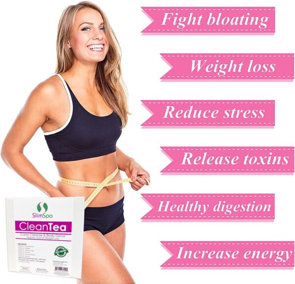 -Reducir la hinchazón- CleanTea ayuda en la digestión de su cuerpo, ayudando a aliviar la hinchazón excesiva al alimentar las bacterias buenas en su intestino para que puedan hacer su trabajo correctamente.