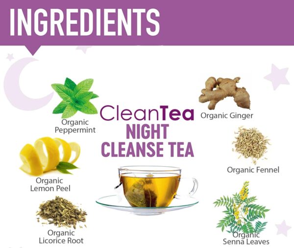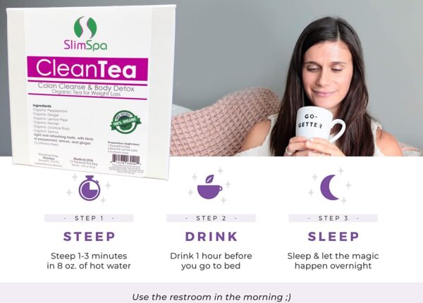 -Limpieza de desintoxicación natural: CleanTEA no contiene té verde ni cafeína, por lo que es un té para dormir seguro para beber por la noche, a diferencia de muchos otros tés de desintoxicación. Desintoxica, calma y limpia el tracto digestivo. Muchos clientes afirman que duermen mejor y tienen menos estrés después de usar nuestro CleanTEA.