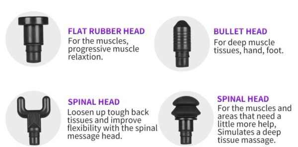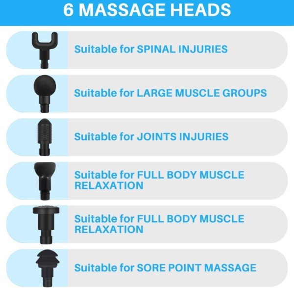4 NIVELES DE INTENSIDAD + 6 CABEZAS DE MASAJE: elija la velocidad que mejor se adapte a sus necesidades y cambie la cabeza de los masajeadores para apuntar con mayor precisión a diferentes partes del cuerpo y grupos musculares. Una construcción robusta lo mantiene estable a todas las velocidades.