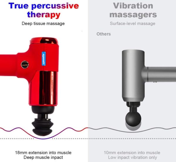 El dispositivo de pistola de masaje de percusión es un dispositivo inalámbrico de masaje de vibración / percusión, utilizado en la terapia de vibración-percusión. Si alguna vez ha visitado a un fisioterapeuta, probablemente haya visto el dispositivo de pistola de masaje de percusión. Funciona como un mini martillo neumático para ayudar a aflojar los músculos tensos y reducir el dolor de las sesiones de entrenamiento.