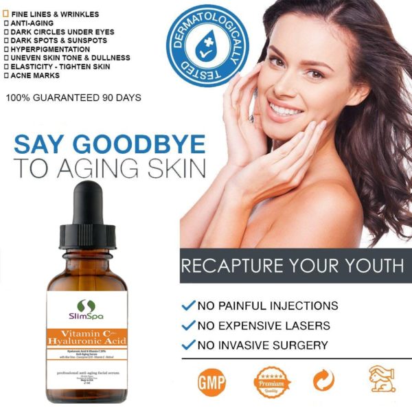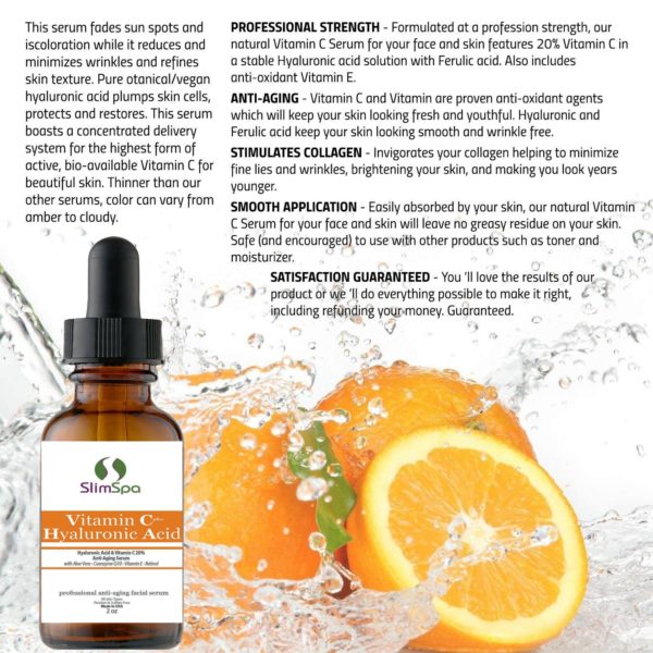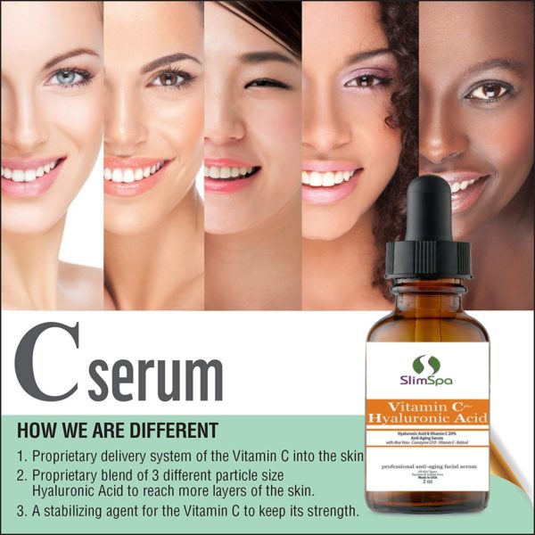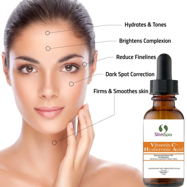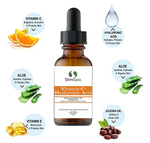 EL SUERO COMPLETO ANTI ENVEJECIMIENTO: esta fórmula mejora los beneficios probados por el tiempo de la vitamina C y el ácido hialurónico, un ingrediente patentado innovador que se ha demostrado que ofrece los beneficios antienvejecimiento más potentes entre los cosméticos de grado no RX. La inclusión del ácido hialurónico proporciona mejoras significativas en la capacidad de las fórmulas para reducir la aparición de líneas finas y manchas de la edad. A través de sus poderosas propiedades antioxidantes, se sabe que la vitamina C protege e hidrata la piel al tiempo que corrige una amplia variedad de imperfecciones de la piel.